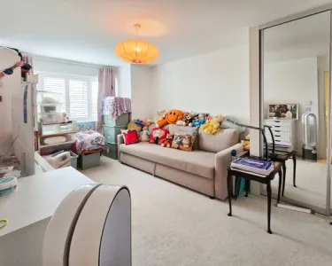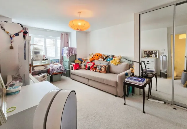 A versatile and inviting space, this area seamlessly combines practicality with comfort. The modern kitchen features sleek white units, an integrated dishwasher, a built-in gas hob with an extractor hood, and a built-in oven, all complemented by stylish contrasting worktops. A convenient built-in storage cupboard provides additional space, with a door leading to the utility room. The open-plan design offers ample room for a dining table and chairs or a relaxed family seating area. Natural light floods in through a rear-aspect window overlooking the garden, while French doors open onto the patio, creating a perfect indoor-outdoor flow