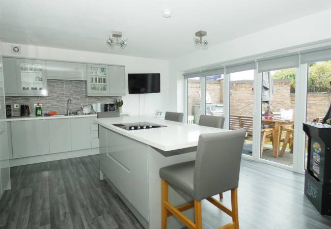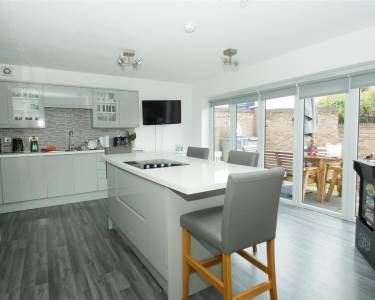equipped with a modern range of base and wall units, working surfaces, tiled splashbacks, built in oven, island with hob and breakfast bar seating, integrated dishwasher, 1.5 bowl stainless steel sink unit, laminate flooring, bi-folding doors onto rear garden.