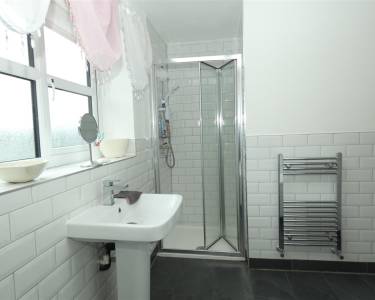 comprising of a four piece suite including bath with tiled surround, shower cubicle, pedestal wash hand basin, low level WC, tiled floor, part tiled walls, heated chrome towel radiator, window to the side elevation.