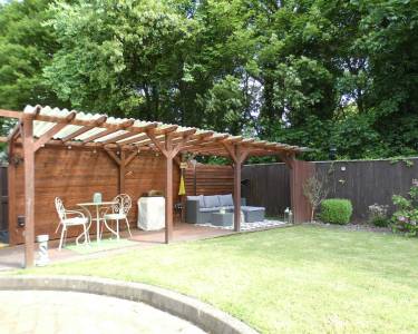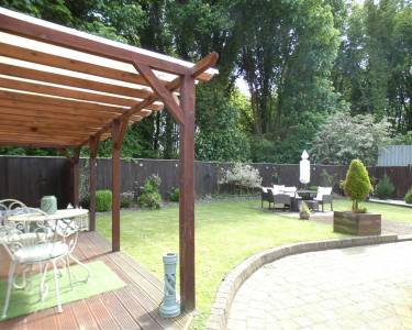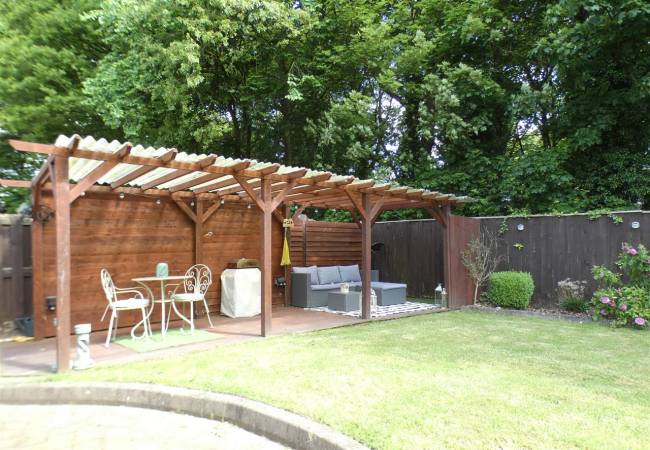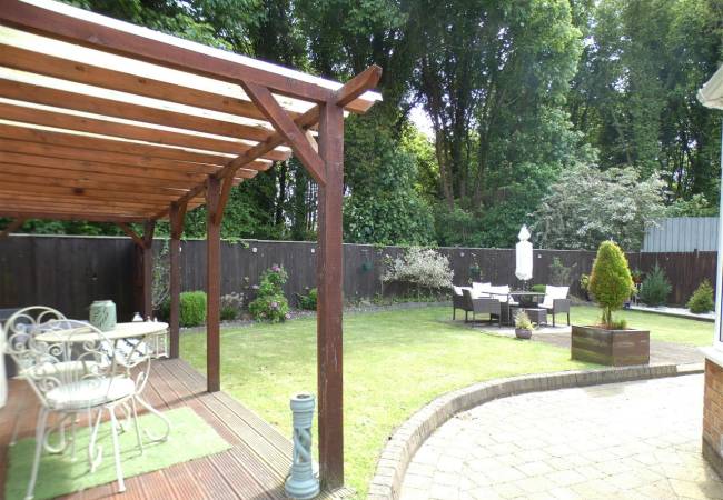 Rear Enclosed garden, laid to lawn with beds and borders, deck area with pergola, not overlooked to the rear.
