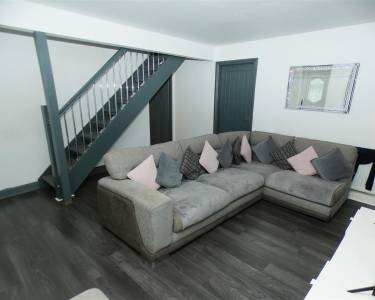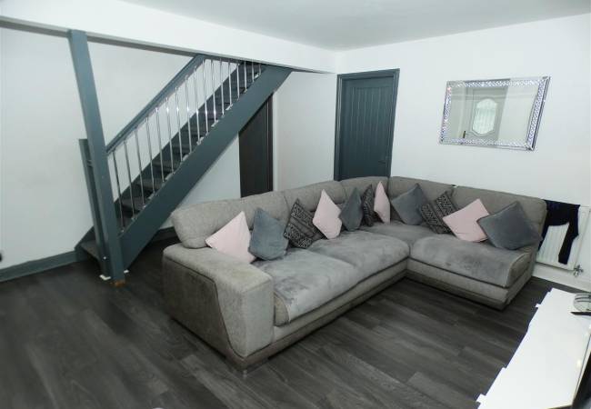with laminate flooring, spot lighting and open tread staircase to first floor.