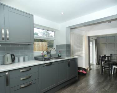 equipped with a matching range of base and wall units, working surfaces, 1.5 bowl moulded sink unit, integrated dishwasher, space for range cooker with extractor hood over, space for American style fridge freezer, tiled splashbacks, laminate flooring, spot lighting, two windows and French doors onto rear garden.